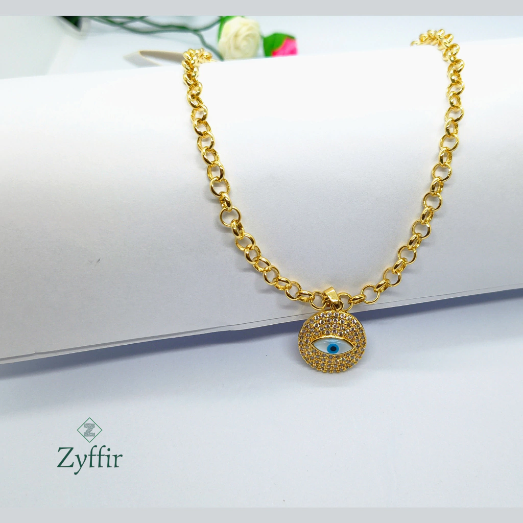 Colar Elo Português com Medalha Cravejada de Zircônia e Olho Grego: Proteção e Estilo!